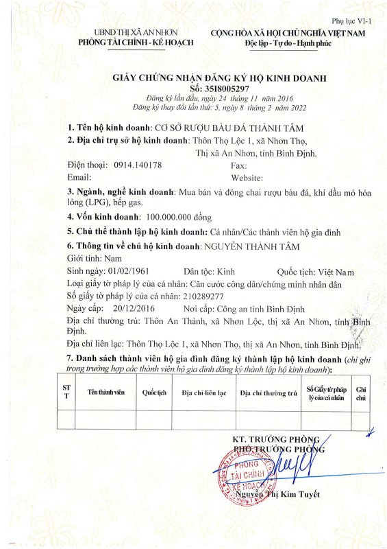CƠ SỞ RƯỢU BÀU ĐÁ THÀNH TÂM